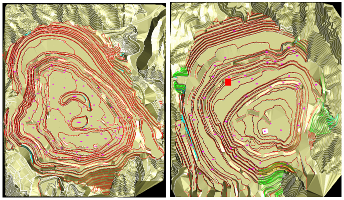 圖1-利用DIMINE構建包含地形、礦體、邊坡等要素的三維實體模型